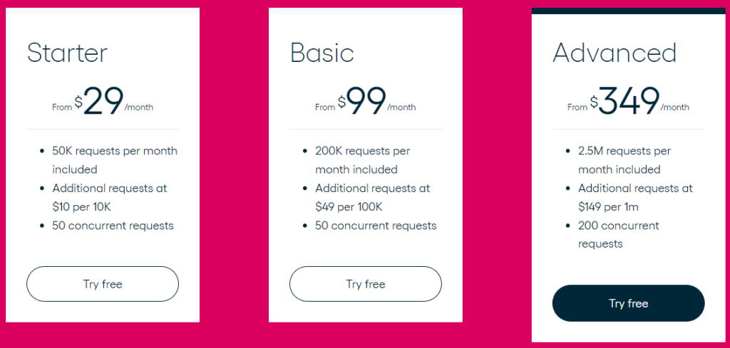 'Temel' planı 99 $ tutarındadır ve ayda 200.000 istek sağlamaktadır. Ek 100.000 istek için 49 $ ile satın alabilirsiniz, ancak eşzamanlı istekler yine 50 ile sınırlıdır.