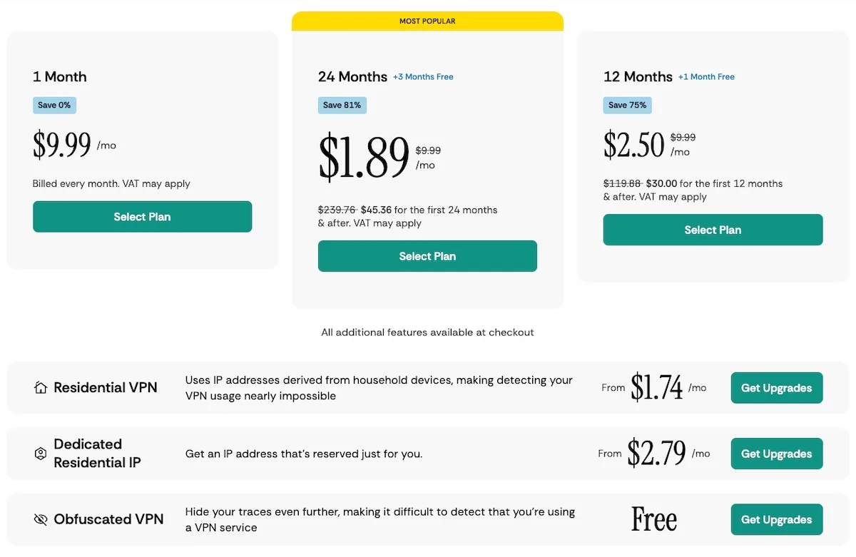 CometVPN, daha uzun taahhütlerde önemli tasarruflar sunan üç standart abonelik katmanı ve en yüksek kaliteli IP adreslerine ihtiyaç duyan kullanıcılar için bir premium Yerel Konut VPN planı sunmaktadır.