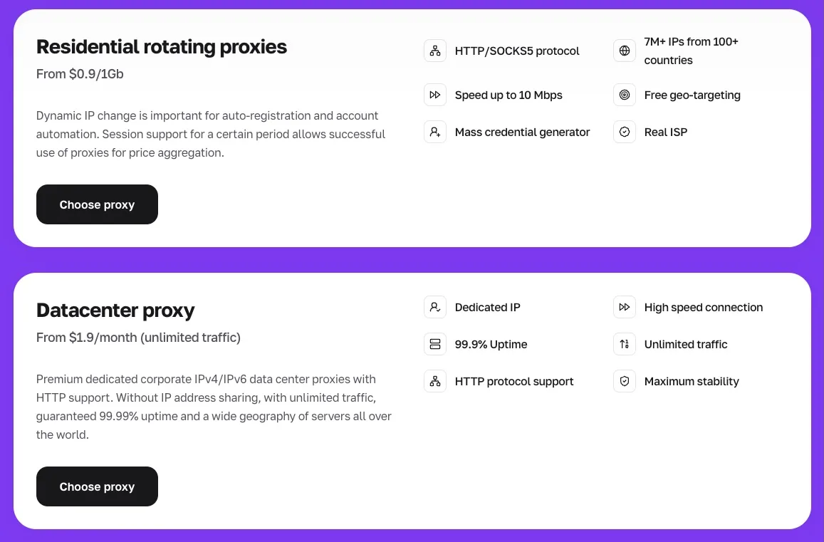 从 $1.9/月 开始,无限流量。这些是专用的 IPv4/IPv6 IP,具有高速连接、99.9% 正常运行时间和最大稳定性。无限流量模型使数据中心代理对高容量任务具有成本效益。