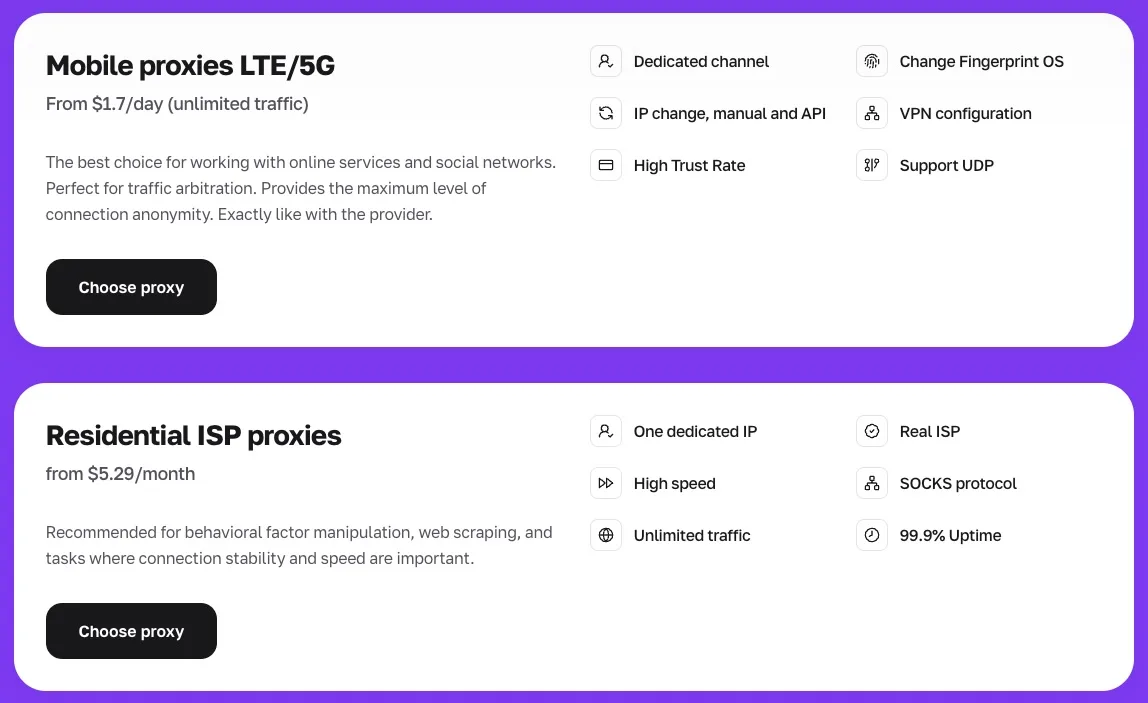 移动代理通过真实的 LTE 和 5G 运营商网络以无限流量运行。它们非常适合社交网络、广告平台、售票和基于账户的工作流等信任敏感的平台。主要功能包括专用通道、手动和基于 API 的 IP 轮换、操作系统指纹切换、VPN/VLESS 配置和 UDP 协议支持。价格从 $1.7/天起。